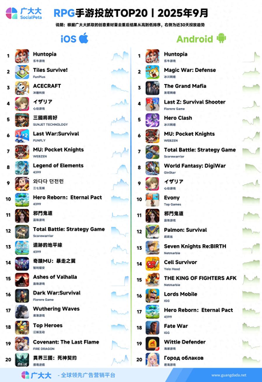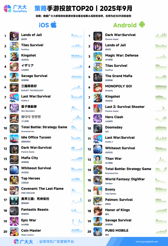 根据广大大——App Intelligence等模块数据,我们整理出2025年9月热门品类手游投放TOP20榜单,包括RPG、策略和模拟类产品,帮助更多出海手游从业人员了解全球移动市场变化趋势。