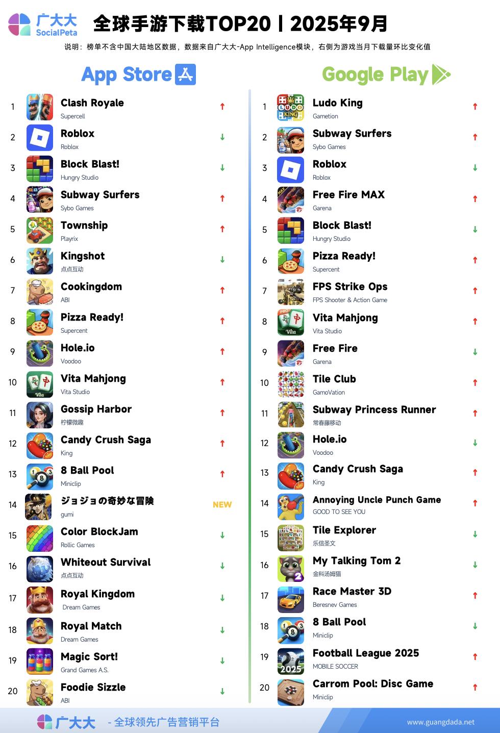 根据广大大——App Intelligence等模块数据,广大大数据研究院整理并发布2025年9月全球手游投放、收入和下载TOP20榜单,帮助更多移动应用从业人员了解全球移动市场变化趋势。