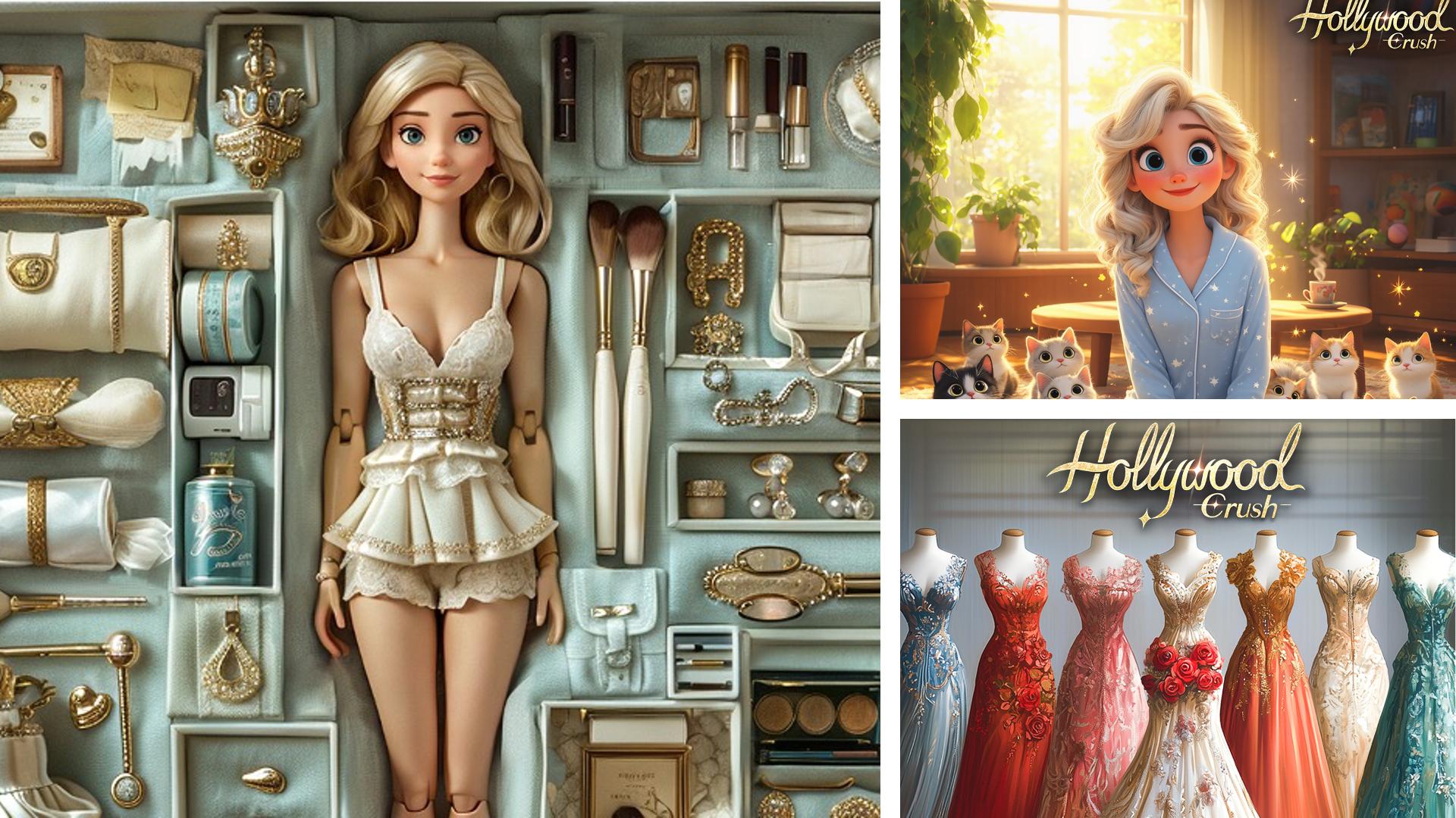 借助AI制图,【Hollywood Crush】投放了许多极为精美的图片素材,有女主+萌宠、女主+化妆、女主+换装类的,以及不少单纯的服装展示、装修展示类素材。其中比较出彩的是女主形象的芭比娃娃概念平铺图,投放多次且展现效果也十分可观。