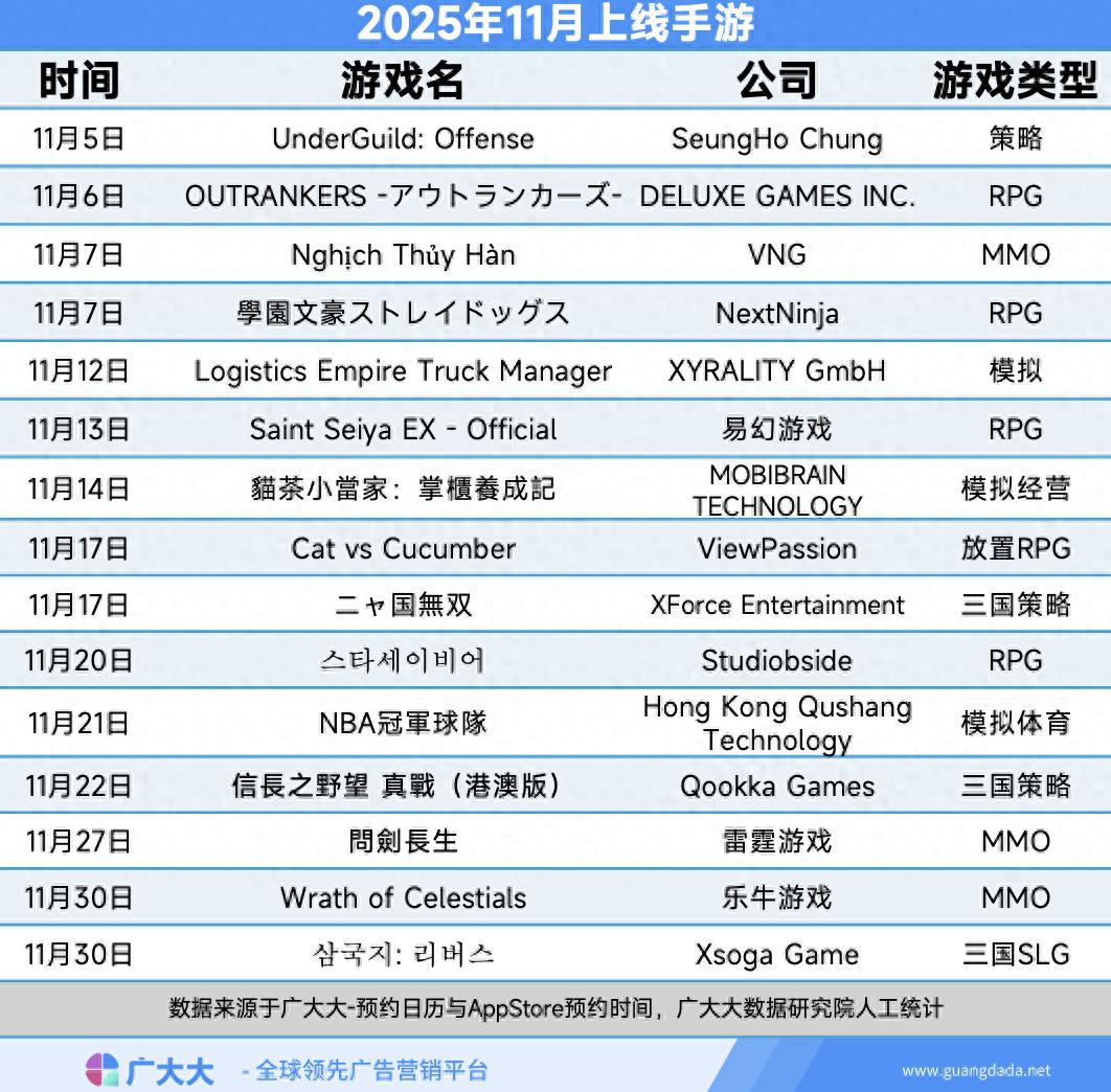 广大大数据研究院根据广大大-预约日历功能,筛选收集了总计15款2025年11月上线手游。