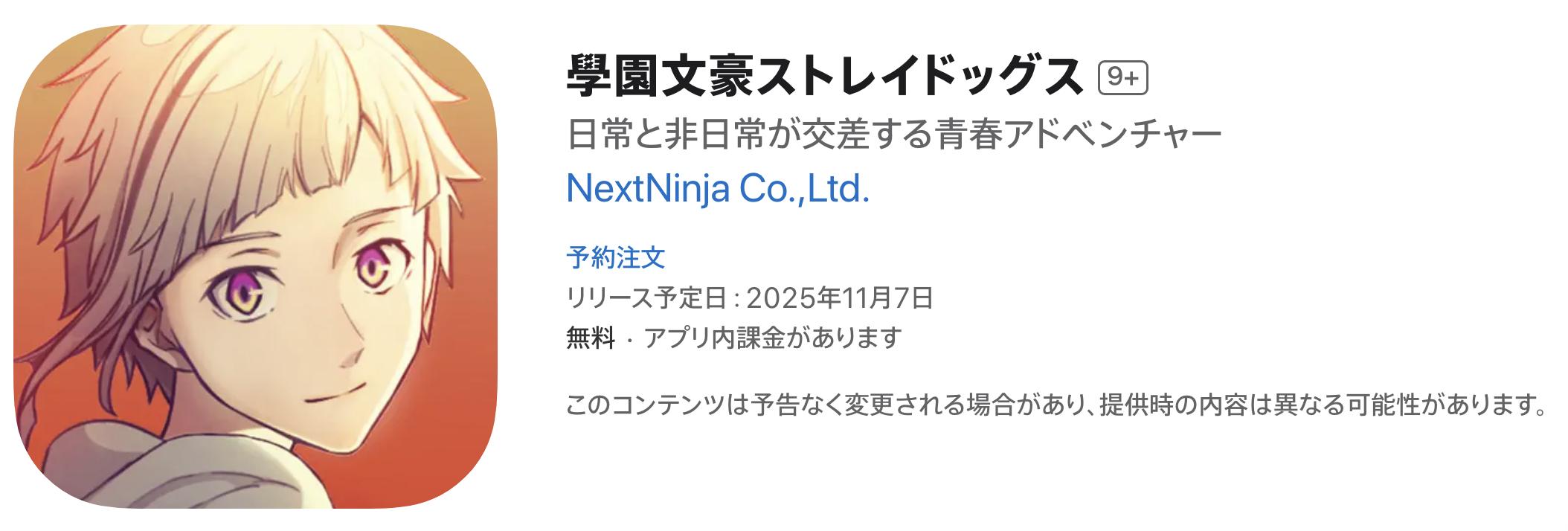 【學園文豪ストレイドッグス】是基于日本知名动漫IP《文豪野犬》研发的二次元抽卡RPG手游,暂定于11月7日正式上线。与其他主打还原类的漫改竞品不同,【學園文豪ストレイドッグス】更像是原作人物的学院IF线,带来与原作“残酷”剧情截然不同的愉悦展开。根据日漫改手游的常规运营日程来说,首次上线一般是日服独占开头,等日服上线满一年后,厂商才会大方地开放国际服,随后才是国服代理。