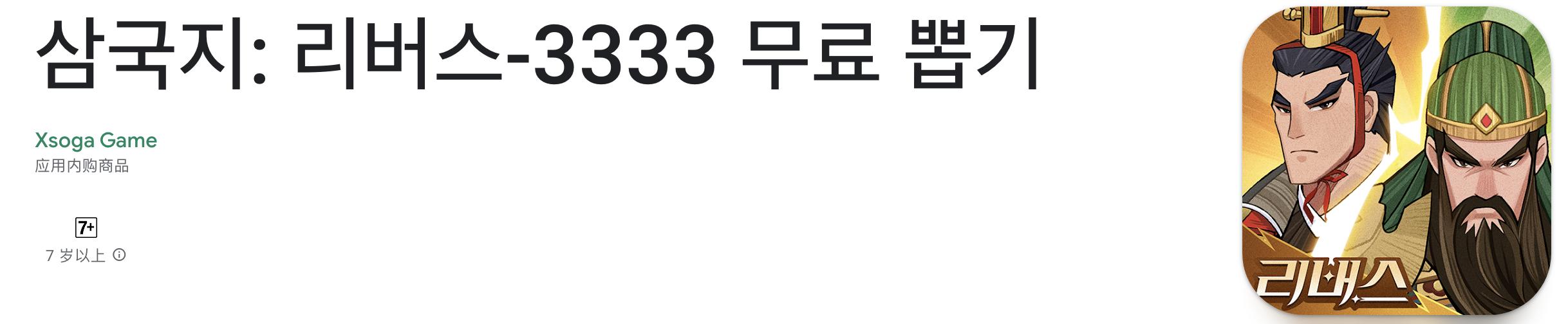 【삼국지: 리버스-3333 무료 뽑기】是由Xsoga Game于韩国发行的三国题材策略手游,游戏ICON是三国战力巅峰角色吕布、关羽双拼,副标题中醒目的“3333抽”大数字着实吸睛,一看便知走福利营销路线。