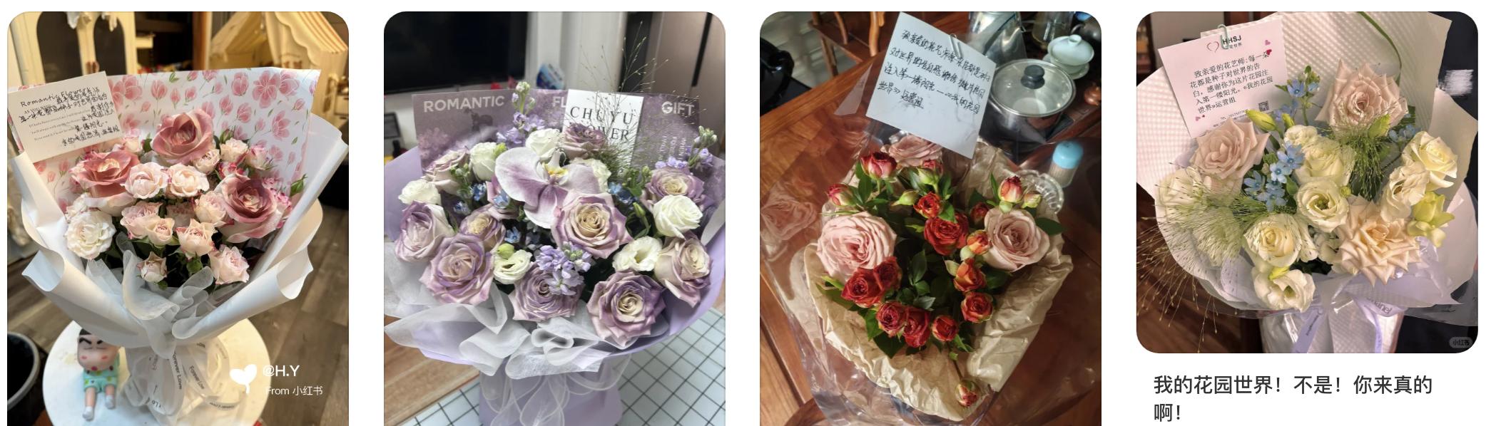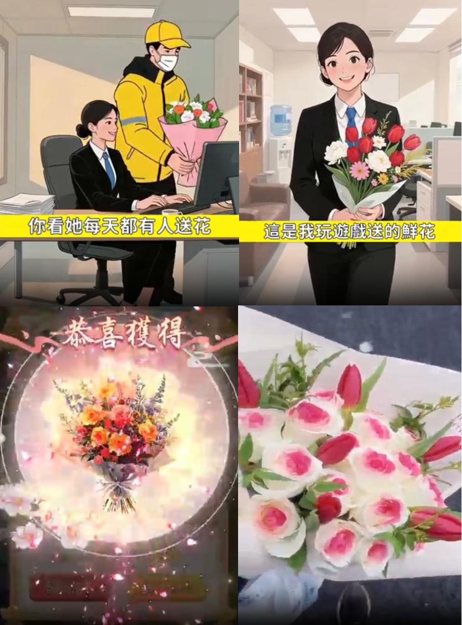 而花作为低购买成本高情绪价值的绝佳礼物,就那么巧妙地将游戏与现实完美串联,让“无价值”的电子数据作为实际可感的珍贵礼物。一束新鲜经过设计的鲜花实在是美丽得无可挑剔。