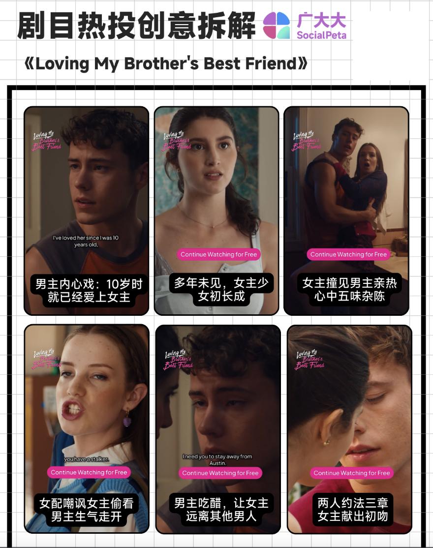 8月其在投短剧中,投放最多的是一部讲述校园虐恋的甜宠短剧《Loving My Brother's Best Friend》:经过一个暑假,女主Henley的外貌发生了巨大的变化,从青涩女孩长成了成熟少女,因此也吸引到了自己哥哥最好的朋友同时也是个花花公子的Luca的注意,两人的故事就此开始了。