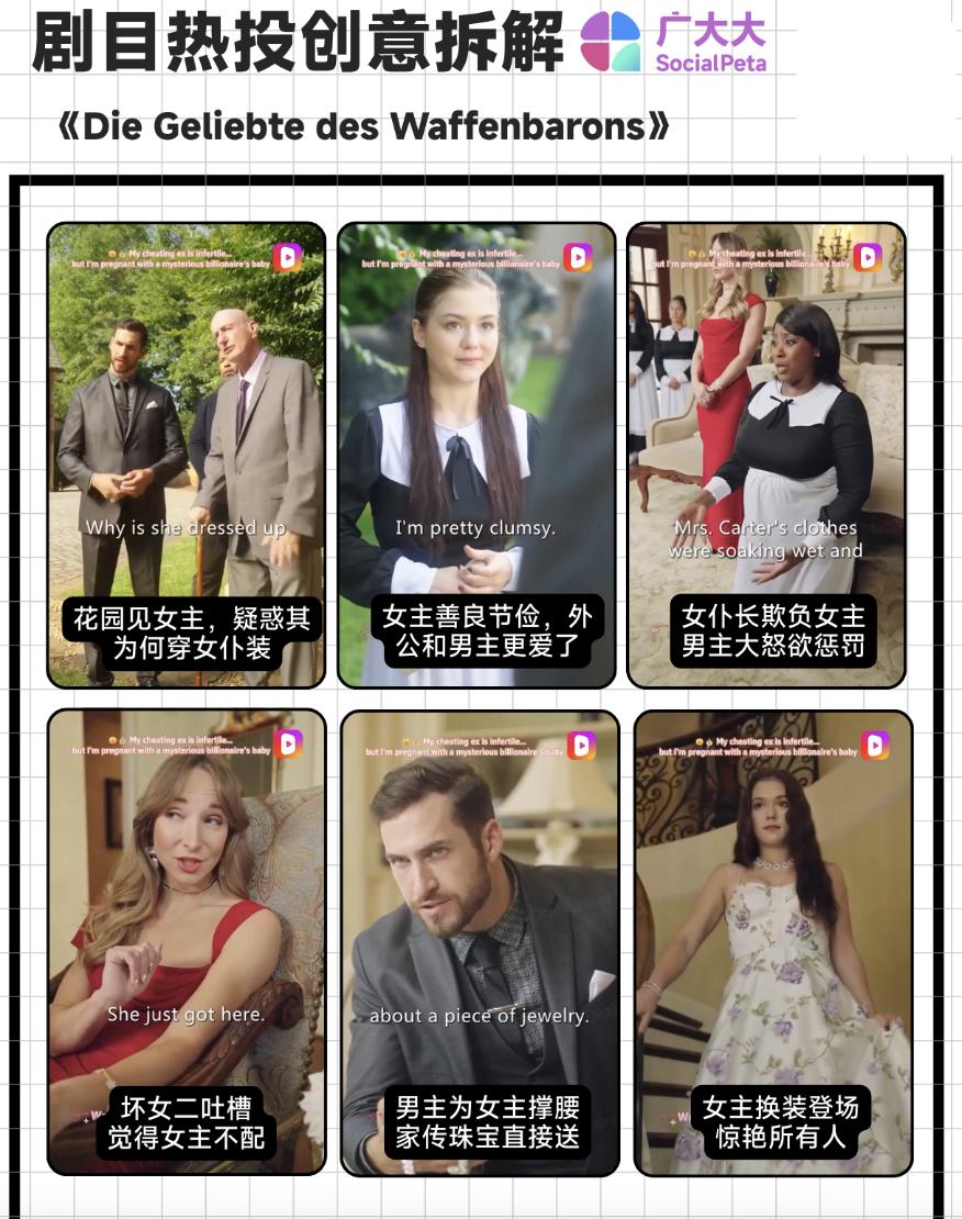 我们再看看8月德国在投新短剧中投放最多的《Die Geliebte des Waffenbarons》,该剧共有15个版本,皆由英文本土剧《Wrong Sperm, Right Love》改编而成。