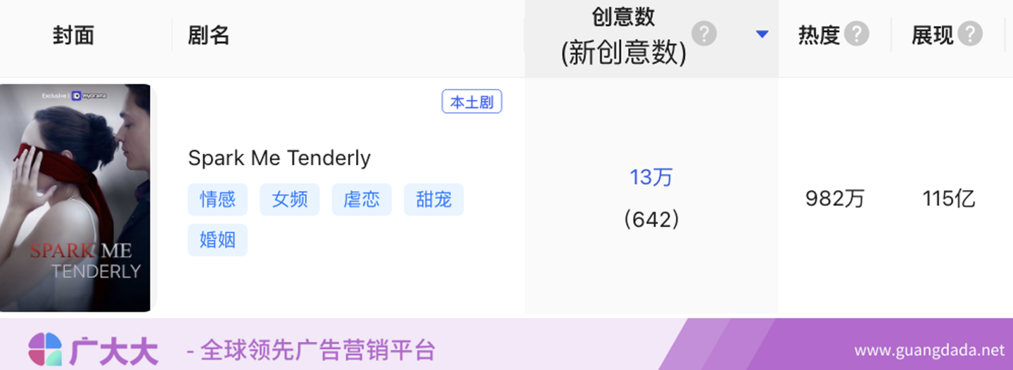 《Spark Me Tenderly》不用多介绍,2025MyDrama当之无愧的剧王、从名字到剧情全面借鉴《五十度灰》的优秀案例。根据广大大抓取数据显示,《Spark Me Tenderly》累计投放买量素材13万条,展现更是逼近120亿。