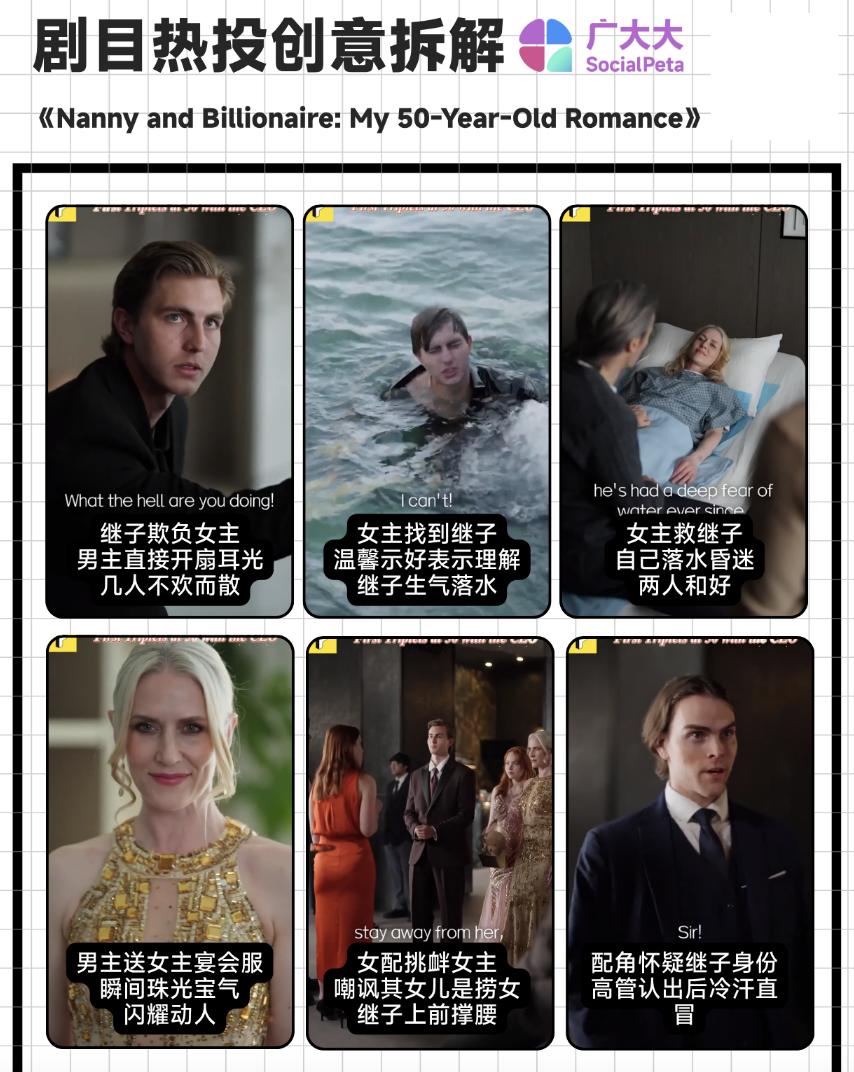 目前该剧投放的去重创意投放数量不低,仅上周便已经超过了2.64K,总体展现估值更是达到了7490W,属于是上榜短剧中的佼佼者。热投素材的剧情主要体现在和男主儿子的交锋——毕竟谁突然多了一个后妈都会有些难以接受,何况是50岁的二婚。当然笔者认为这种情况还是和国内的环境比较适配,就是不知道海外观众作何感想了。