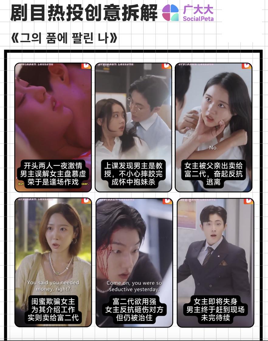 韩国短剧也是好起来了,被迫出卖自己还债的女主遇上了身份显赫的大学教授,只一眼笔者就能看出剧本出自国人班底,但那熟悉的“西八”和“诶一西”却也让该剧韩味十足。目前该剧正有18个不同版本在投,其中英文版投放最高,韩文原版其次。