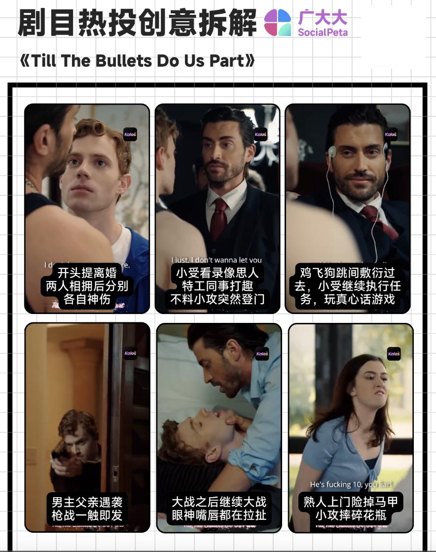 下面我们来浅拆下该剧的热门创意素材:开局直接用“离婚”这个大冲突打出王炸,让观众们迅速进入“八卦”状态;中间男二直接突袭男一住处,隐藏身份可能被发现的危机感以及甜蜜重逢的惊喜感叠加,让剧情变得更加有趣和吸引人;后面的枪战则是提升紧张感,大幅提升了后面两人交流感情的激情程度,颇有种史密斯夫夫的既视感;剧情最后依然以“掉马甲”作为主要噱头,在保持观众好奇心上面效果极佳。