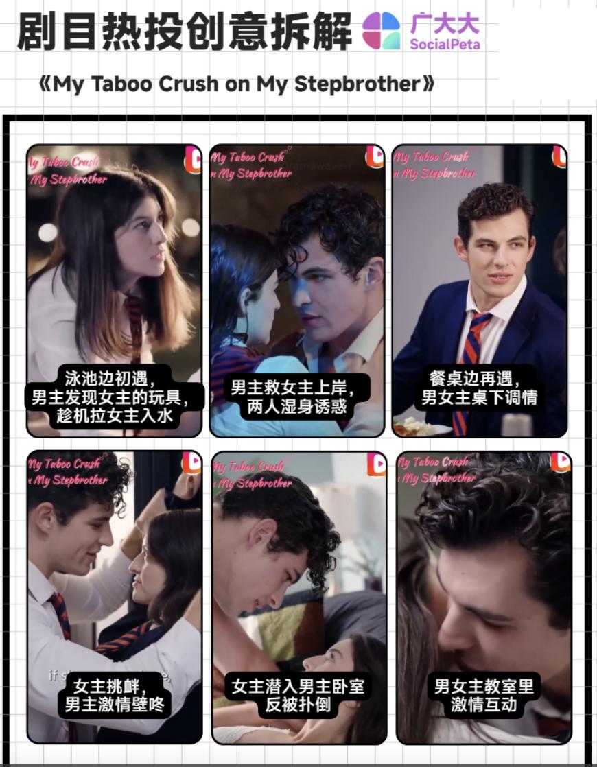 整个素材围绕男女主大尺度拉扯展开,热度极高,这段素材仅投放七天,展示估值就高达 8.9 万。男女主初遇时,男主发现女主的身份和 “玩具”,恶趣味爆发,拉女主入水,观众大概率也能想到,女主是传统的 “不会游泳” 设定,这样男女主就能顺利上演湿身诱惑了!接下来是熟悉的餐桌场景,男主挑逗女主,二人还在餐桌下进行了一番 “友好交流”,笔者想说,其他人还在呢,你们这样真的好吗?最后,男女主在教室门前调情,随着老师脚步声临近,观众的心也跟着悬了起来,他们会被发现吗?
